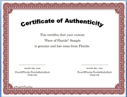 Certificate of Authenticity for Your sample of a Piece of Florida